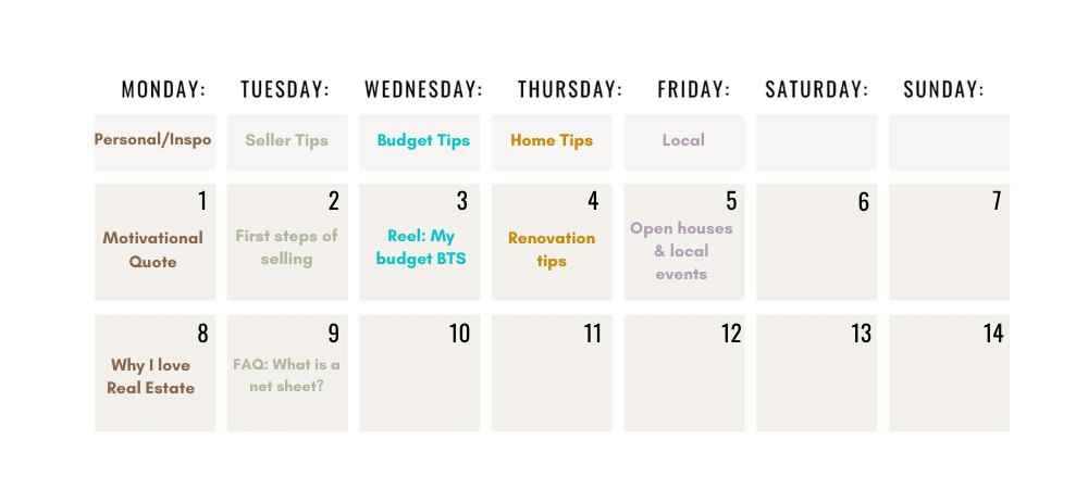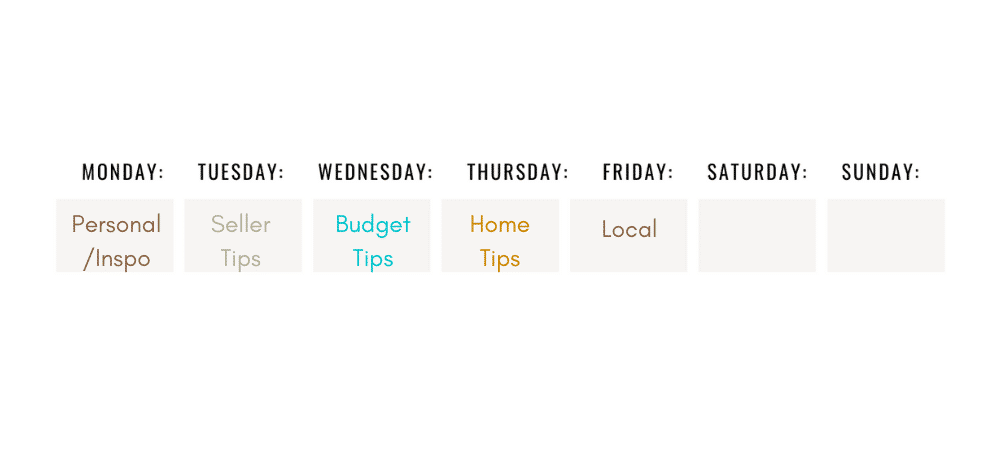 Start by assigning your content pillars to the days of the week. In the example below, you will see every Tuesday, you would post content geared toward sellers, and on Wednesdays, the content would be focused on budget tips.