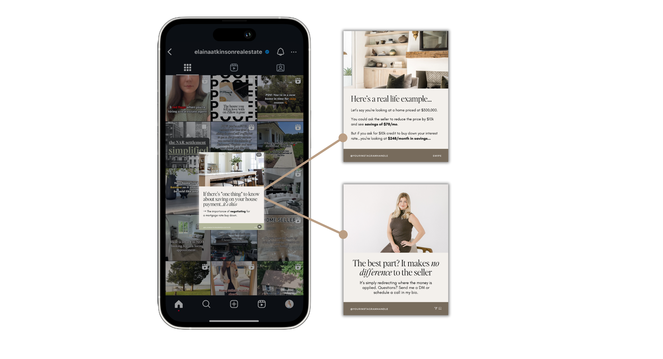 Elaina relies on C&C's feed templates to create relevant, bookmark-worthy content that helps build trust, grow her following, and generate quality leads. These types of posts are great for nurturing your current audience and establishing yourself as a trusted expert.
