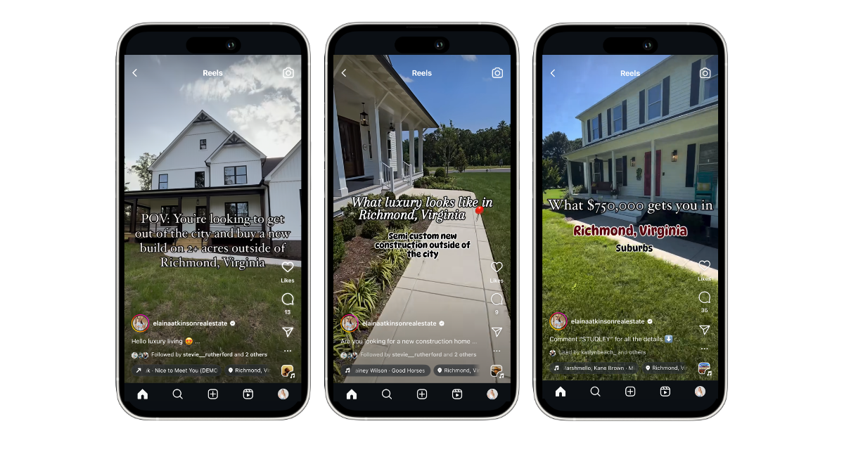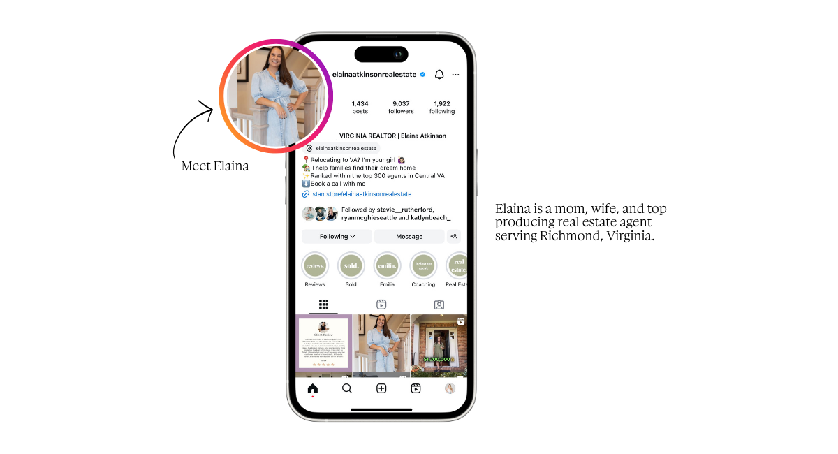 Elaina shows up in her stories every day, sharing a mix of real estate insights and behind-the-scenes glimpses of her life. This daily presence is where real conversations begin—whether she’s featuring a new listing, sharing tips, or just showing a slice of her day, stories create an easy way for followers to engage. It’s in these casual interactions that connections form, leading to real relationships and ultimately, conversions.