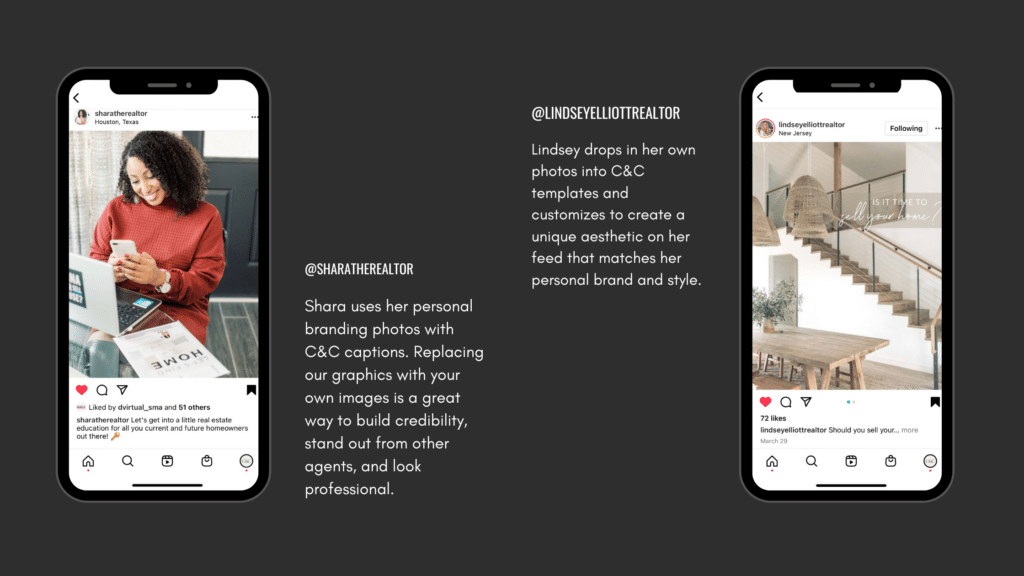 Shara uses personal branding photos with Coffee & Contracts captions. Replacing our graphics with your own images is a great way to build credibility, stand out from other agents, and look professional.