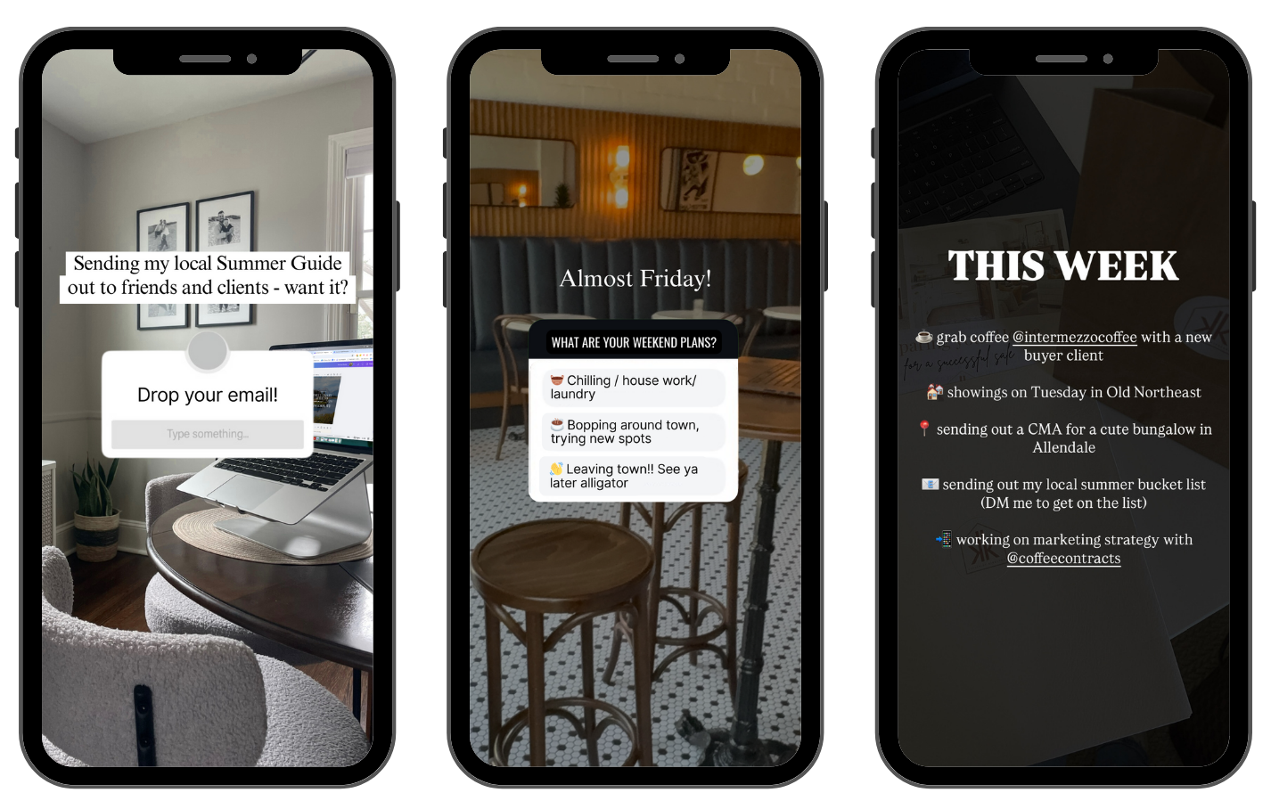 Get on Stories daily. Share behind-the-scenes moments like grabbing coffee, touring a home, or working from your car. Use question boxes, polls, and DMs to create conversations, not just content. This builds trust and loyalty fast.