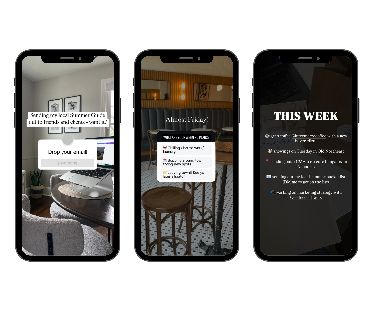 Get on Stories daily. Share behind-the-scenes moments like grabbing coffee, touring a home, or working from your car. Use random questions to ask in question boxes, polls, and DMs to create conversations, not just content. This builds trust and loyalty fast.