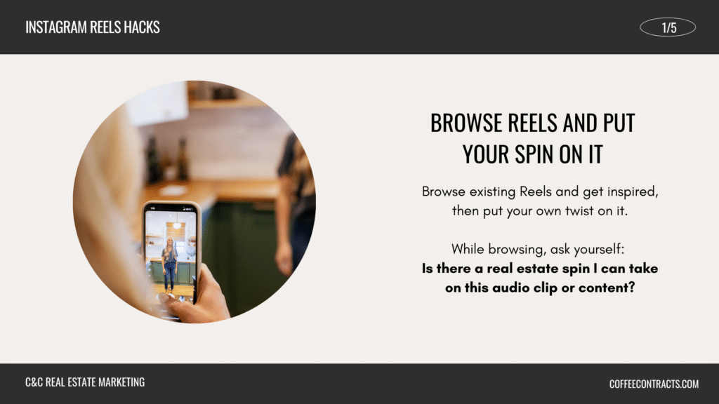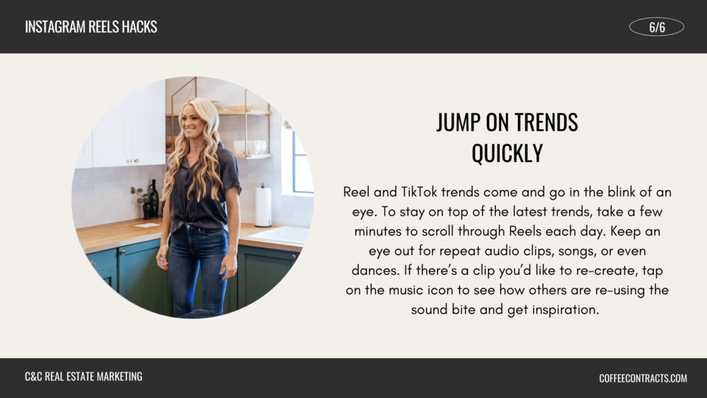 Coffee & Contracts Members, browse the Content Vault for trending Reel ideas, or subscribe to our weekly newsletter where we deliver 3 trending Reels (with ideas to make them real estate related!).