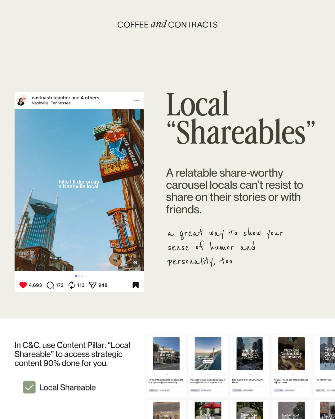 Local Shareables - Posts designed to get shared by locals. When your content gets shared on Instagram, it reaches people who don't follow you yet. That's how you grow. These create that "tag your friend who needs to see this" moment.
